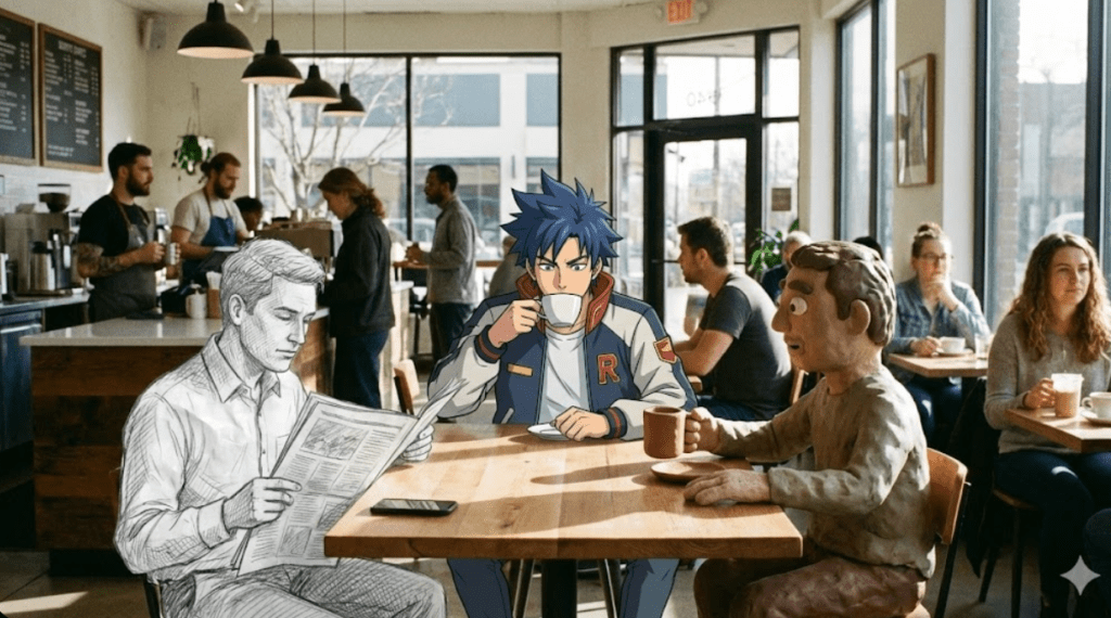 A bustling morning café scene in realistic photography. One character is anime-styled, one is a pencil sketch, and one is a stop-motion clay figure. All styles blended seamlessly into one scene. Aspect ratio: 16:9.