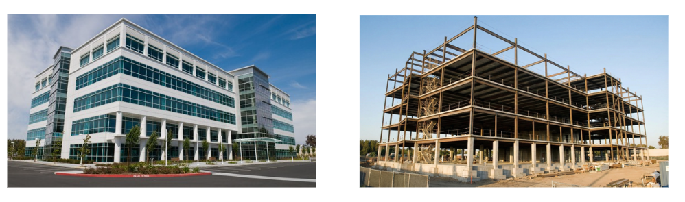 Deconstruct the building shown in the reference image. Show only steel framework, foundation pillars, concrete slabs, and scaffolding. Remove all glass, exterior walls, paint, and finishes. Keep the same camera angle, lighting direction, and perspective.
