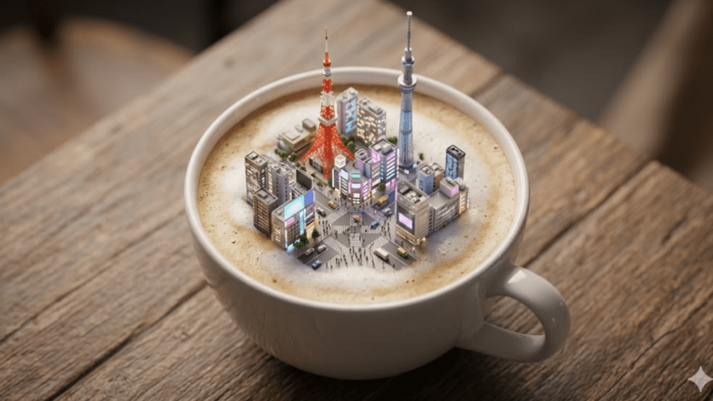 A close-up porcelain coffee cup on a wooden table filled with cappuccino foam, subtly floating a detailed miniature city of Tokyo inside the cup. Show Tokyo Tower, Skytree, Shibuya Crossing, and dense neon buildings. Tiny vehicles move through streets. Cinematic lighting, shallow depth of field, ultra-photoreal, 8K finish. Aspect ratio: 16:9.