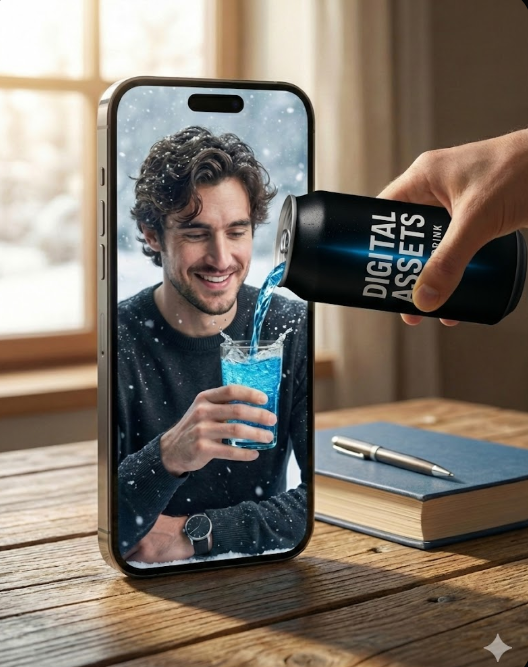 Recreate the same scene and camera composition from the reference image where a hand pours a drink into a glass held by a person inside a smartphone screen. Replace the bottle with my branded drink. Match liquid color, splash physics, refraction, and depth perfectly. Keep lighting soft natural window daylight. Style: Ultra-photorealistic commercial advertising realism.