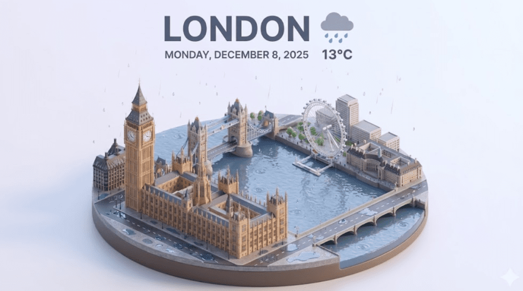 Use Search Grounding to fetch today’s real-time and accurate weather data for London, UK. Create a 45° top-down isometric miniature 3D cartoon city of London featuring Big Ben, Tower Bridge, London Eye, and the River Thames. Use soft PBR materials, cinematic lighting, and gentle atmospheric depth. Integrate the current live weather condition into the environment (clouds, rain, sun, fog, and reflections). At the top center, display “LONDON”, today’s date, a weather icon, and the current temperature. Output: 1080×1080, ultra-sharp, premium UI overlay.